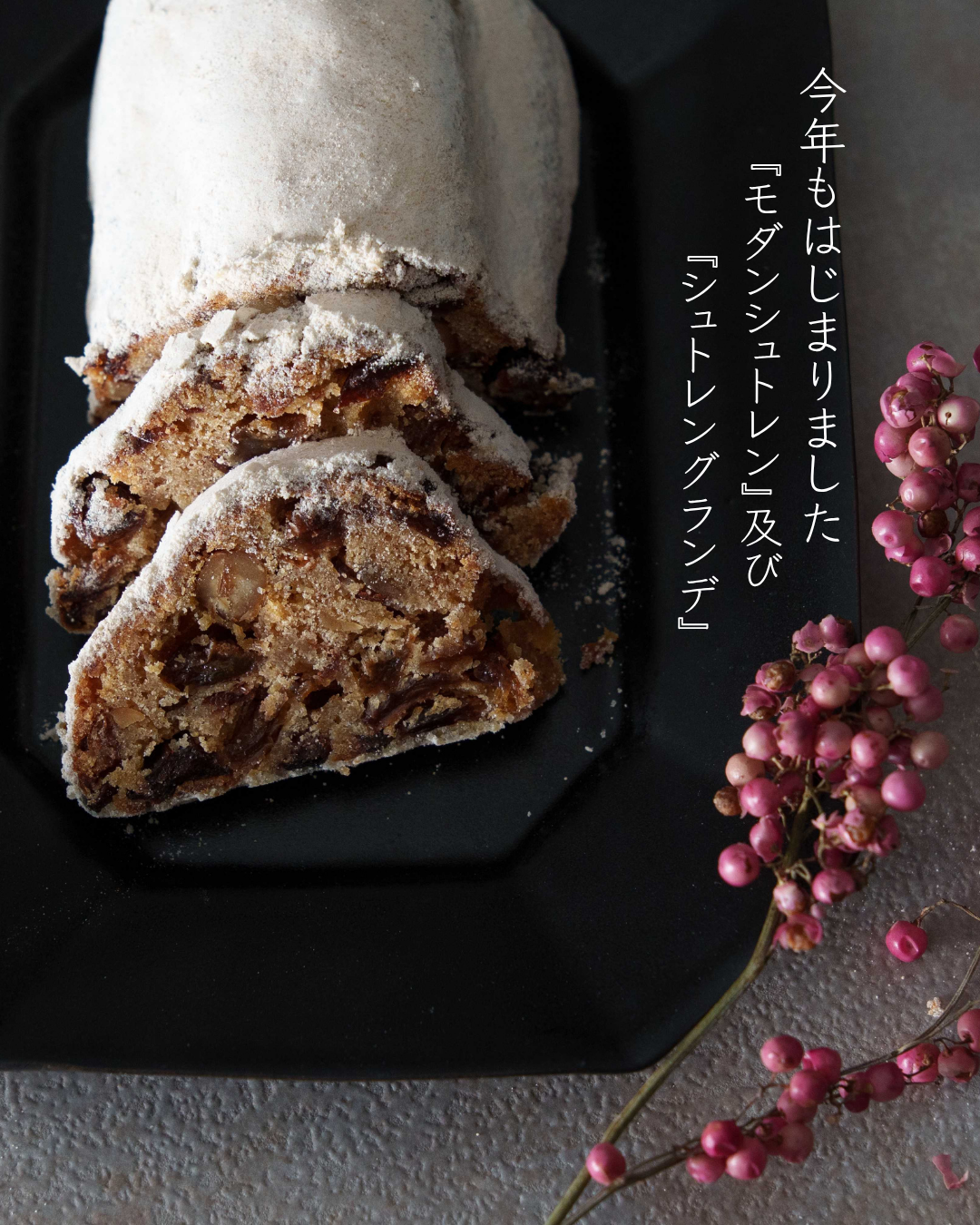冷蔵庫で保存していたシュトレンは、食べる時に1~1.5cmにスライスして、やや常温に戻してからお召し上がりください。